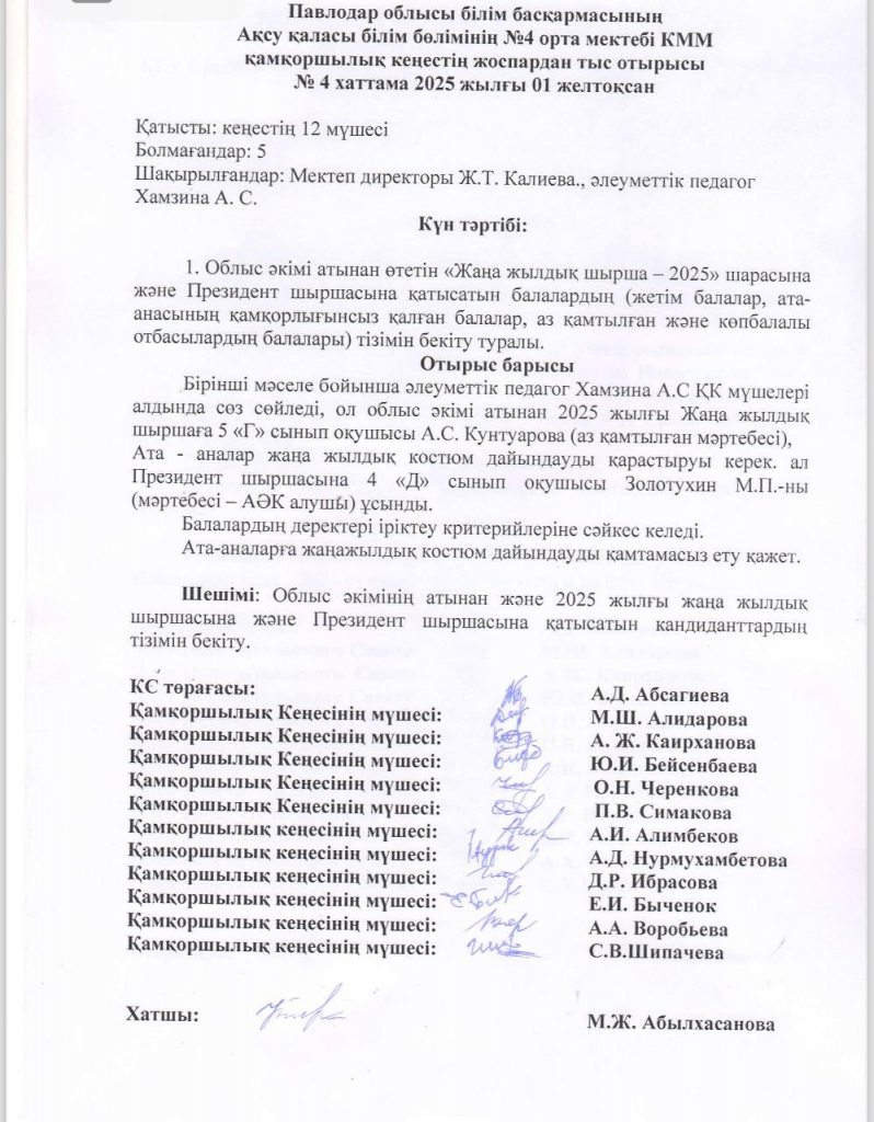 Жоспардан тыс отырысы №4 хаттама 2025 жылғы 01 желтоқсан Posted on 01.12.202518.12.2025 By admin Қамқоршылық кеңес