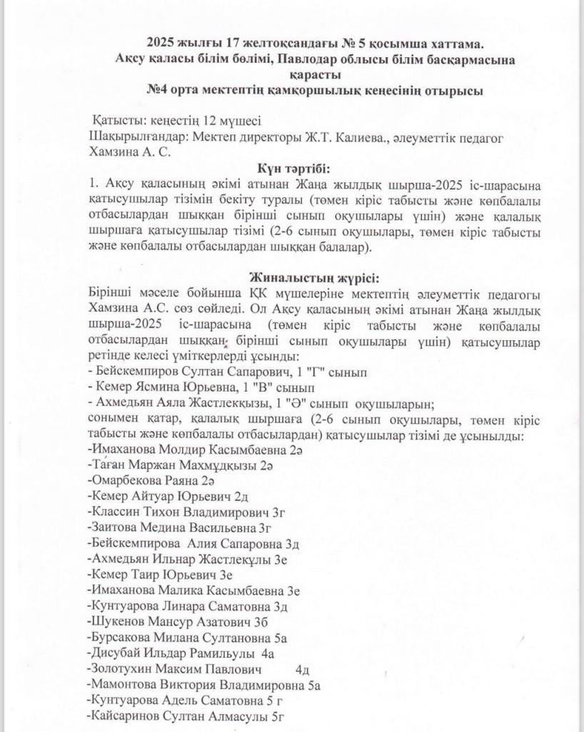 2025 жылғы 17 желтоқсандағы №5 қосымша хаттама Posted on 17.12.202505.01.2026 By admin Асхана, Қамқоршылық кеңес